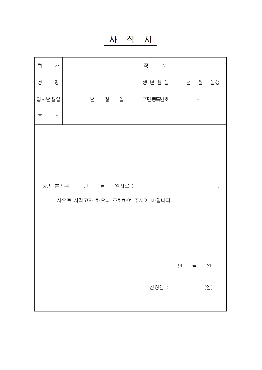 1. 사직서 : 맨 아래 첨부한 파일은 PC에서 다운받아 사용하시기 바랍니다~